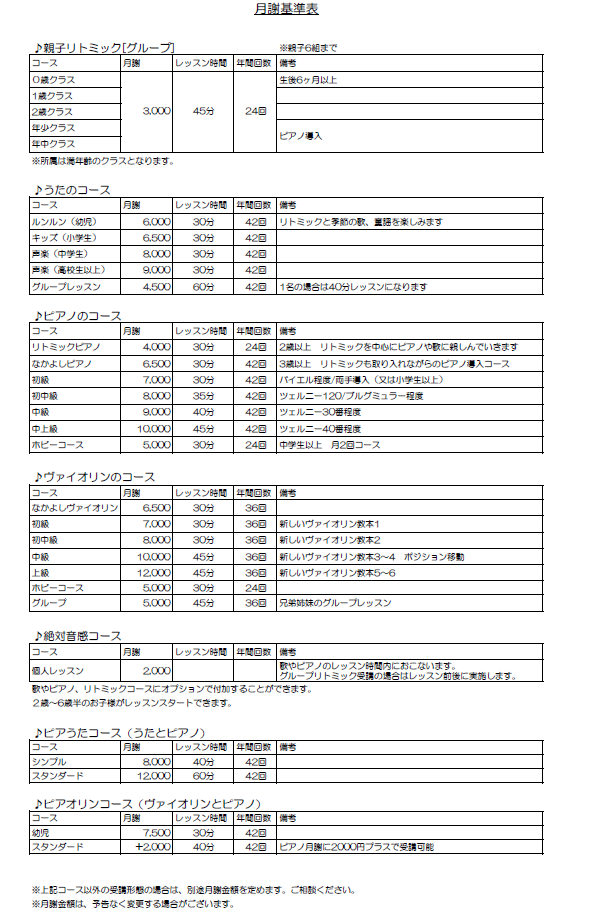 月謝表【花音~かのん~音楽教室】